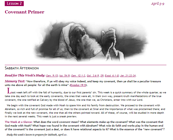 在本週的學課裏面, 我們要對整季學課做個概述。 我們分別會查考早期的約, 以及 上帝與幾位先祖立約的內容。 所以我們將會分五個範疇來研究探討: