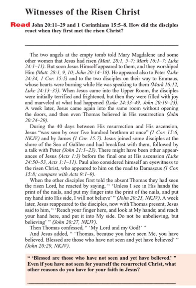 因此,我們看見在 耶穌復活之後,很多人目見 耶穌。 在約翰福音二十章二十九節, 耶穌對多馬說:「你因看見了我才信;那沒有看見就信的有福了。」