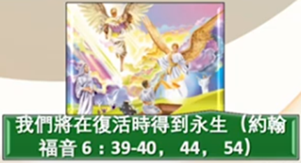 ( 約翰福音 6 章 39、40、44、54 節: 39 差我來者的意思就是:他所賜給我的,叫我一個也不失落,在末日卻叫他復活。 40 因為我 父的意思是叫一切見 子而信的人得永生,並且在末日我要叫他復活。」44 若不是差 我來的 父吸引人,就沒有能到 我這裏來的;到 我這裏來的,在末日 我要叫他復活。54 吃 我肉、喝 我血的人就有永生,在末日 我要叫他復活。)