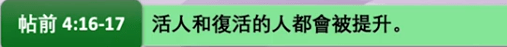 ( 帖撒羅尼迦前書 4 章 16、17 節: 16 因為 主必親自從天降臨,有呼叫的聲音和天使長的聲音,又有 上帝的號吹響;那在 基督裏死了的人必先復活。 17 以後我們這活着還存留的人必和他們一同被提到雲裏,在空中與 主相遇。這樣,我們就要和 主永遠同在。)