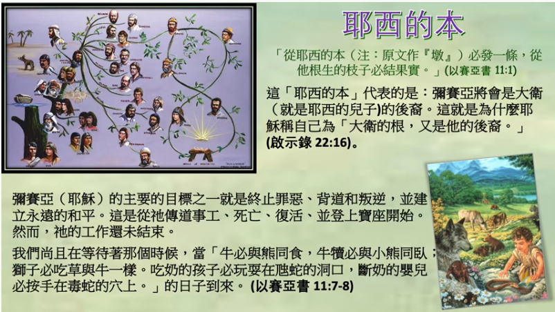 這「耶西的本」代表的是﹕彌賽亞將會是大衛 (就是耶西的兒子) 的後裔。這就是為什麼 耶穌稱自己為「大衛的根」, 又是他的後裔。」啟示錄 22 章 16 節