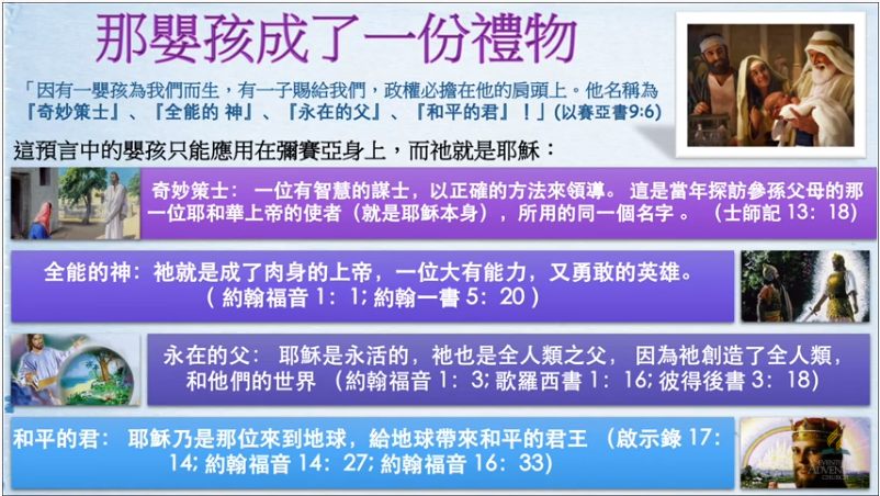 「因有一嬰孩為我們而生﹑有一子賜給我們。政權必擔在祂的肩頭上。祂名稱為奇妙﹑策士﹑全能的 神﹑永在的父﹑和平的君。」