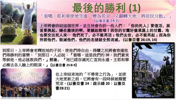 上帝將會終結這個世界, 並且 祂會告訴一些人們 :「你的死人」要復活, 屍首要興起。睡在塵埃的啊, 要醒起歌唱 ! 因你的甘露好像菜蔬上的甘露, 地也要交出死人來。。。 他們死了, 必不能再活 : 他們去世, 必不能再起; 因為 袮刑罰他們, 毀滅他們, 他們的名號就全然消滅。(以賽亞書 26 章 19 至 14 節)
