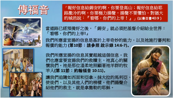我們所應宣揚的信息, 其實超越這個信息。 我們也應當要宣揚我們的 救贖主, 祂真心的關懷我們。 祂是那位溫柔地照顧著 祂羊群的牧羊人 (正如第十一節所說的 :「祂必像牧人牧養自己的羊群﹑用膀臂聚集羊羔抱在懷中﹑慢慢引導那乳養小羊的」 ; 約翰福音10 章 11 節)。 各位, 讓我們追隨西面和阿拿﹑抹大拉的馬利亞﹑使徒們﹑以及其他忠心的人的榜樣。 他們揚聲介紹他們的 救主, 就是拿撒勒的 耶穌。
