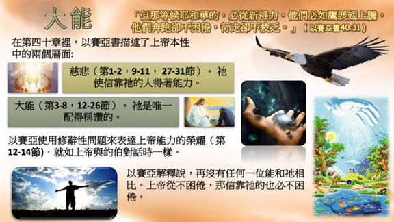 這段修辭性的問題及三度比喻講及大地和地上之物, 聽起來好像 上帝對約伯的回答, 是嗎 ? 以賽亞解釋說, 再沒有任何一位能和 祂相比。 上帝從不困倦, 凡那信靠 祂的也必不困倦。