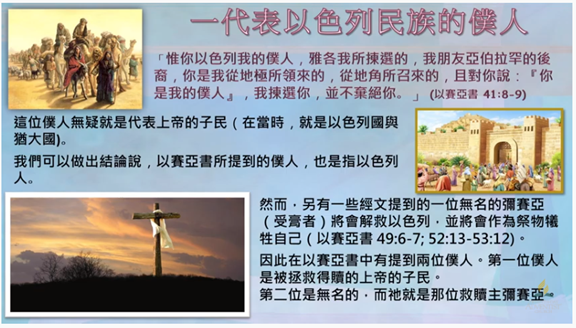 因此, 在以賽亞書中有提到兩位僕人。 第一位僕人是被拯救得贖的, 上帝的子民 ; 第二位是無名的僕人, 而 祂就是那位救贖主 彌賽亞。