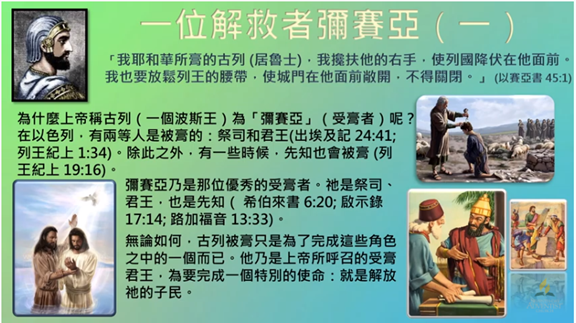 或者你會提問 : 為什麼 上帝稱古列(一個波斯王)為「彌賽亞」(受膏者) 呢 ? 原來在以色列, 有兩等人是被膏的 : 包括祭司和君王 (出埃及記 24 章 41 節 ; 列王記上 1 章 34 節)。 除此之外, 有一些時候, 先知也會被膏 (列王記上 19 章 16 節)。 而 彌賽亞乃是那位優秀的受膏者, 祂是祭司﹑君王﹑也是先知。而 祂就是 耶穌。 無論如何, 古列被膏只是為了完成這些角色之中的一個而已。 祂乃是 上帝所呼召的受膏君王, 為要完成一個特別的使命 : 就是解放上帝的子民。