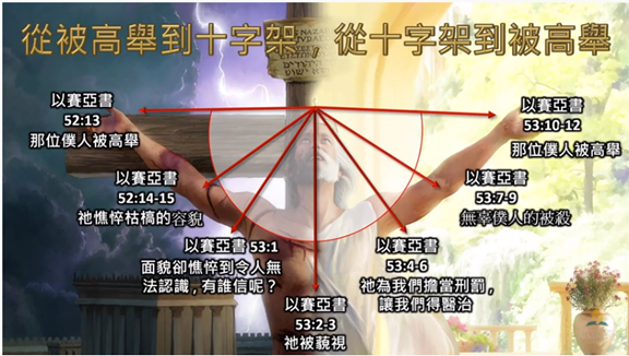- 以賽亞書 53 章 10-12 節 在這段經文描述到這位僕人, 藉著祂的犧牲, 最後也被高舉