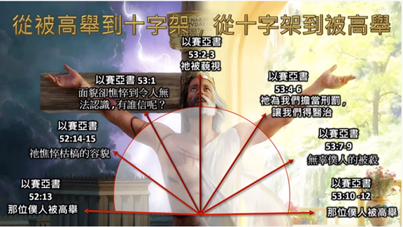 此上圖表以希伯來人文學寫作的手法來看這段經文。 大家要知道, 為了方便閱讀, 聖經中的章節和提示標題, 是近代才加上去的。 所以在以賽亞書 52 章 13 節至到 53 章 12 節是一首詩。 而希伯來人喜歡取用平衡交叉式的寫作, 就好像上樓梯落樓梯這樣, 左右兩邊是互相對應, 以中間是最高的地方也是重點。 而這首詩的最高點就是描述到 耶穌被藐視。