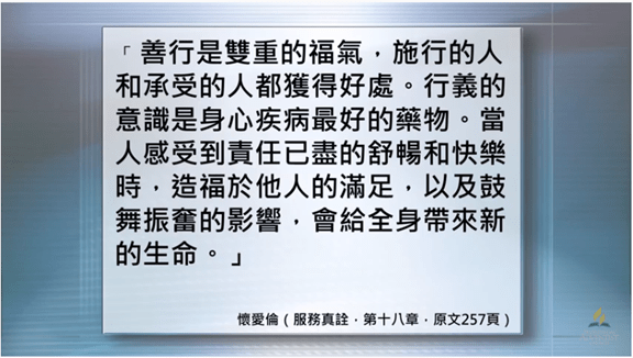 「善行是雙重的福氣, 施行的人和承受的人都獲得好處。 行義的意識是身心疾病最好的藥物。 當人感受到責任已盡的舒暢和快樂時, 造福於他人的滿足, 以及鼓舞振奮的影響, 會給全身帶來新的生命。」