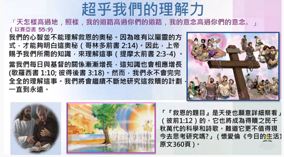 當我們每日與基督的關係漸漸增長的時候, 這知識也會相應增長 (歌羅西書 1 章 10 節 ;彼得後書 3 章 18 節)。 縱使如是, 我們永不會完完全全的理解這事。 我們將會繼續不斷地研究這救贖的計劃, 一直到永遠。