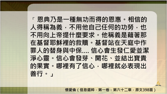 - 若他是永遠停止犯罪, 行善的話, 那我們就會面對一個嚴重的問題, 因為在羅馬書 3 章 12 節這樣說 「。。。沒有行善的, 連一個也沒有 !」 在 3 章 23 節也說到「因為世人都犯了罪, 虧缺了 上帝的榮耀。」 大家世上每一個人都有罪, 而且世人不能靠著自己的善行而得到救贖。