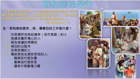 這些工作就是彌賽亞在 上帝的恩年要做的。 但這些工作是否只是彌賽亞 耶穌的任務嗎 (路加福音 4 章 16 至 21 節) ? 大家想一想, 或許它也是我們的任務, 叫我們去宣告 「耶和華的恩年」?