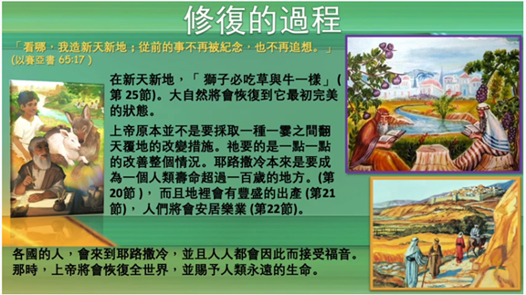 在這裏 上帝應許有一個新天新地。在這新天新地裏 :「豺狼必與羊羔同食、獅子必喫草與牛一樣。。。」, 大自然恢復到最初原有的狀態。