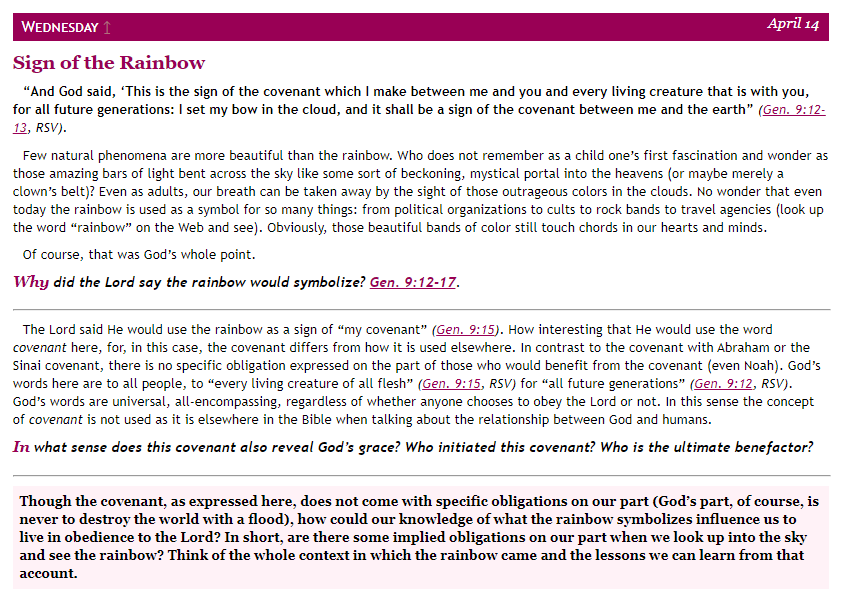 在洪水過後, 上帝將虹放在雲彩中, 作為立約的記號。 這次是人類第一次見到的彩虹。何解呢? 因為在洪水之前, 是沒有下雨的。 上帝是藉著霧氣來滋潤大地, 但是在洪水之後, 大自然也起了變化。 每當 聖經提到 上帝與人類立約, 人類要成為這永遠之約的一部分, 就必須要接受一些條件。我們必須要心甘情願的接受 上帝的約。