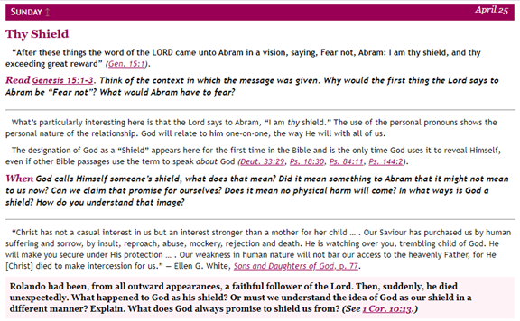 我們這季學課的作者, 他在這本書「應許: 上帝永恆的約」是這樣說的: 「這裏所說的『盾牌』或保護, 不是指戰爭的保護或是指災難中對身體有形的保護。 相反地, 他指的是保證亞伯拉罕和他未來的後代, 免受無法履行盟約的可能性。。。」