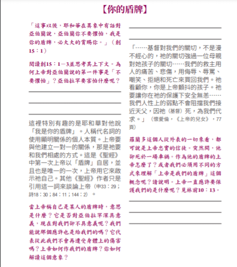 「 我是你的盾牌」這一句說話, 我們可以看到 上帝以一種親密的語氣, 向亞伯蘭介紹自己。 上帝不只是一個「盾牌」,而是你的「盾牌」, 同樣地 上帝也是我們的「盾牌」。