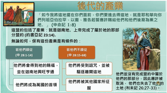 上帝與他們立的約, 是包括了產業, 這個產業是一個地方, 就是迦南地。 上帝完成了屬於 祂的那部分盟約, 最後在約書亞的帶領之下進入了迦南地 (約書亞記二十三章十四節)。