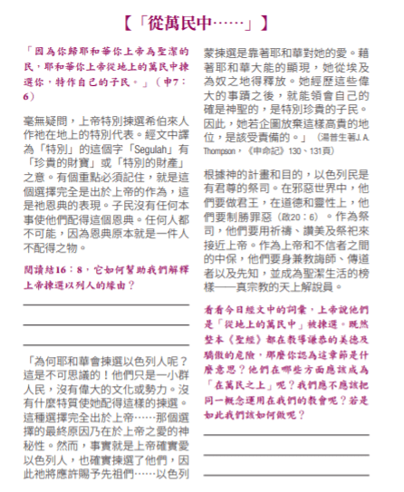 「因為你歸耶和華袮 上帝為聖潔的民、耶和華袮 上帝從地上的萬民中揀選你、特作自己的子民。」