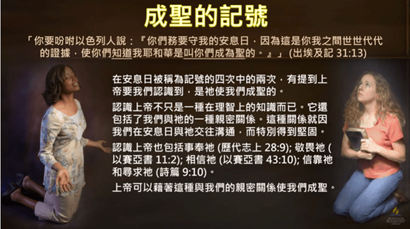 在安息日被稱為記號的四次中的兩次, 有提到 上帝要我們認識到, 是 祂使我們成聖的。認識 上帝並不只是一種在理性上的知識而已, 它還包括了我們與 祂的一種親密關係。 這種關係, 就因我們在安息日與 祂交往﹑與 祂溝通, 而特別得到鞏固。