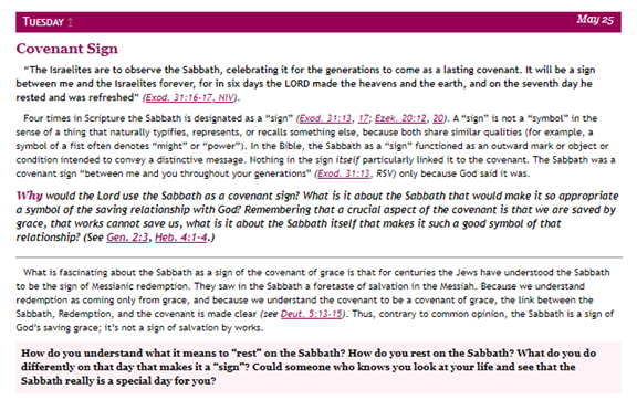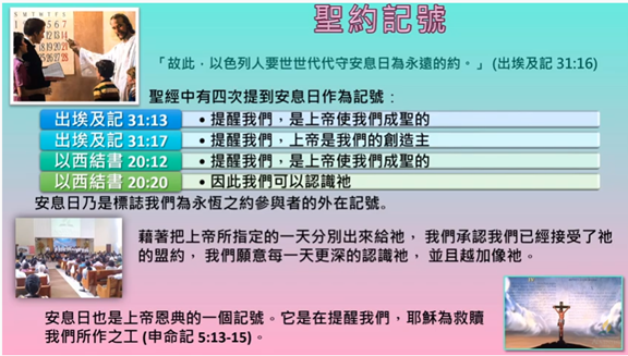 因此, 安息日也是 上帝恩典的一個記號。安息日是在提醒我們, 耶穌為救贖我們所作之功。