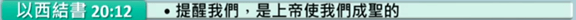 (3) 以西結書 20 章 12 節:「又將我的安息日賜給他們、好在我與他們中間為證據、使他們知道我耶和華是叫他們成為聖的。」