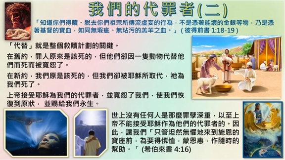 在舊約, 罪人原來是該死的, 但他們卻因一隻動物, 代替他們而死﹑而被寬恕了。