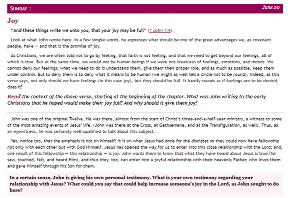 但是新約的喜樂, 卻是我們今日就可以擁有的。 這是 上帝國度裏當下的一部份(羅馬書十四章十七節), 也是聖靈果子的一部份 (加拉太書五章二十二節)。 其實這種喜樂不是短暫的歡樂, 而是內心的平安。