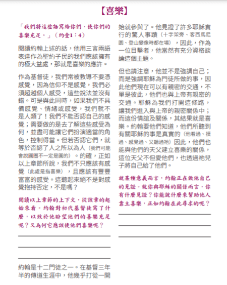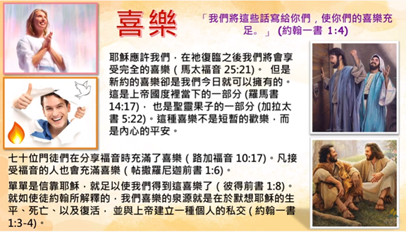 在路加福音十章十七節記載「七十位門徒們再分享福音時充滿了喜樂」; 帖撒羅尼迦前書一章六節也記載到:「凡接受福音的人也會充滿喜樂」。