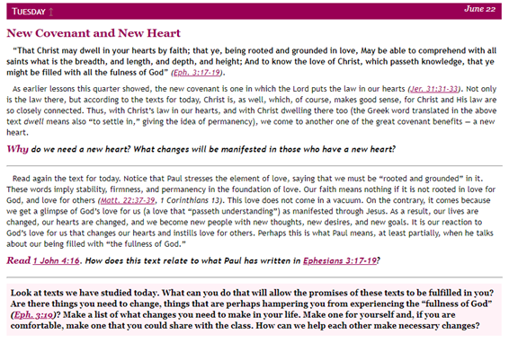 上帝的律法被書寫在我們的心上, 而我們的思想也會被對 上帝和我們的鄰居的愛所充滿 (馬可福音12章30﹑31節)。
