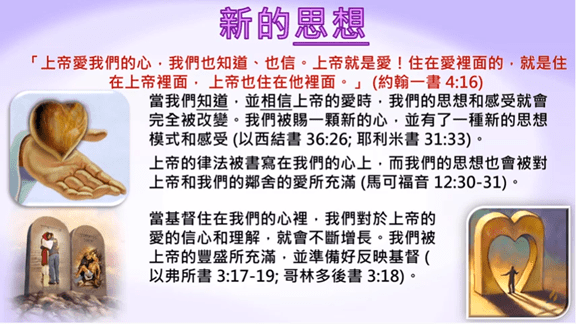 當我們知道, 並相信 上帝的愛的時候, 我們的思想和感受就會完全被改變。 我們被賜一顆新的心, 並有了一種新的思想模式和感受