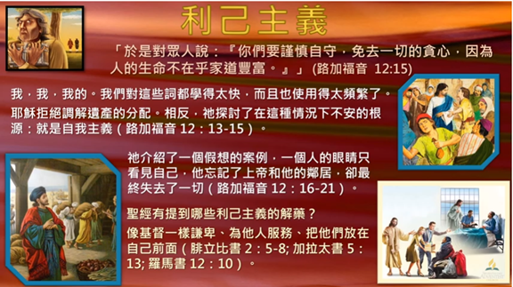 耶穌介紹了一個假想的案例,一個人的眼睛只看見自己,他忘記了 上帝和他的鄰居,卻最終失去了一切 (路加福音十二章十六至二十一節)。