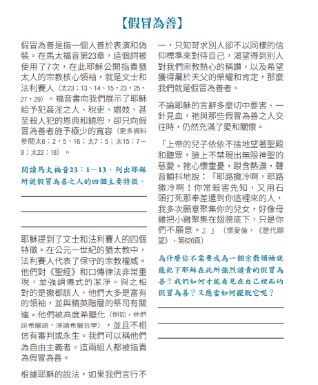 「13 你們這假冒 為善的文士和法利賽人有禍了!因為你們正當人前,把天國的門關了,自己不進去,正要進去的人,你們也不容他們進去。15 「你們這假冒為善的文士和法利賽人有禍了!因為你們走遍洋海陸地,勾引一個人入教,既入了教,卻使他作地獄之子,比你們還加倍。23 你們這假冒為善的文士和法利賽人有禍了!因為你們將薄荷、茴香、芹菜獻上十分之一,那律法上更重的事,就是公義、憐憫、信實,反倒不行了。這更重的是你們當行的,那也是不可不行的。24 你們這瞎眼領路的,蠓蟲你們就濾出來,駱駝你們倒吞下去。25 你們這假冒為善的文士和法利賽人有禍了!因為你們洗淨杯盤的外面,裏面卻盛滿了勒索和放蕩。27 你們這假冒為善的文士和法利賽人有禍了!因為你們好像粉飾的墳墓,外面好看,裏面卻裝滿了死人的骨頭和一切的污穢。29 你們這假冒為善的文士和法利賽人有禍了!因為你們建造先知的墳,修飾義人的墓,」