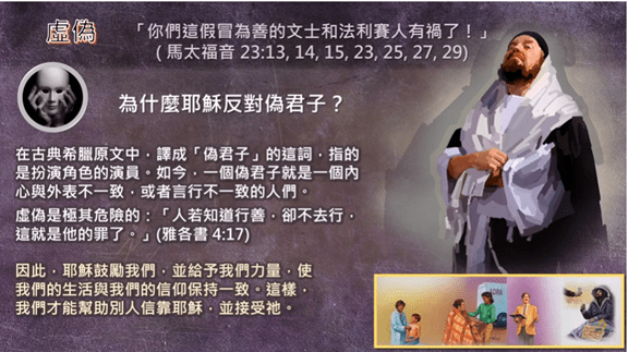 偽君子、假冒為善,的確是 外在的一個假面具,我們要把它拆除。 因此,耶穌鼓勵我們,並給予我們力量,使我們的生活、與我們的信仰,保持一致。這樣我們才能幫助別人信靠耶穌,並接受耶穌。