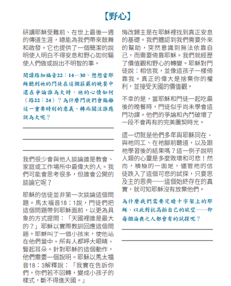 耶穌把一個小孩子放在他們中間,然後教導他們。他們不應該垂涎在這世界上的豐功偉績 (馬太福音十八章一至三節)。