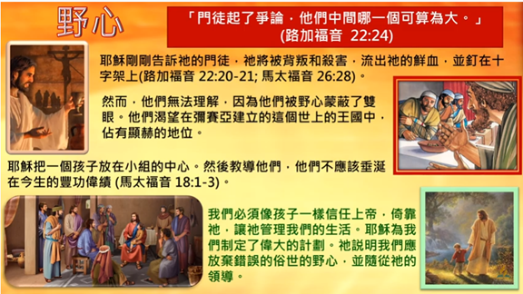 我們必須像孩子一樣,信任 上帝、依靠 上帝,並且讓 上帝管理我們的生活。 耶穌為我們制定了偉大的計劃, 祂說明我們應放棄錯誤的俗世野心,並跟隨 祂的領導。