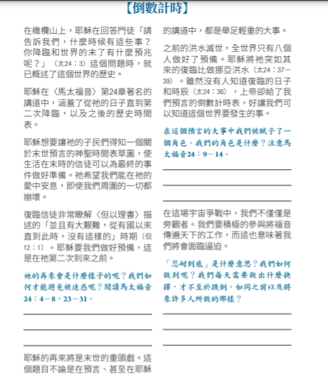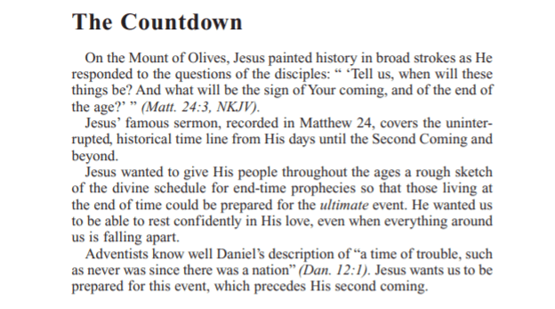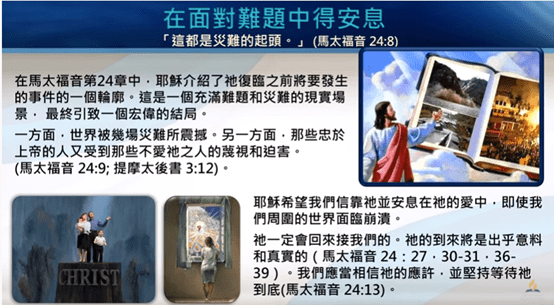 在馬太福音 24 章中,耶穌介紹了 祂復臨之前,將要發生的事件的一個輪廓。這是一個充滿難題、和災難的現實場景,而最終就會引致一個宏偉的結局。