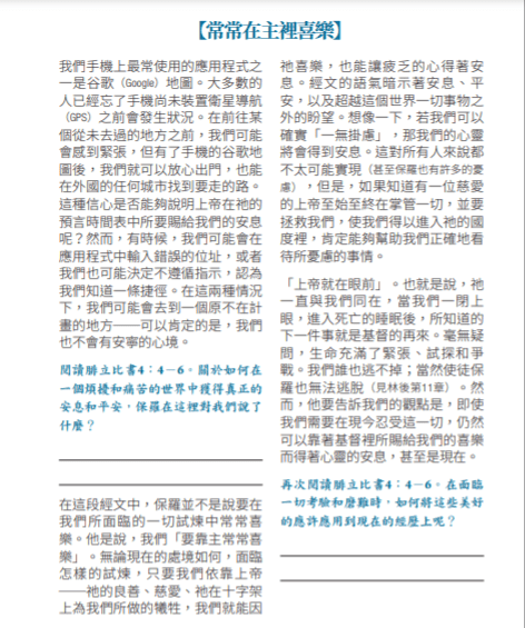 「你們要靠主常常喜樂!我再說,你們要喜樂!」