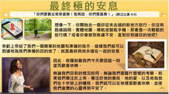 這樣我們就可以到達 祂為我們準備的目的地了: 就是最終與 祂永遠在一起的安息。