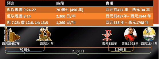 它是由公元前 457 年直到公元後 1844 年作為結束。而二千三百日的預言,是包含了七十個七、一七之半、1260 日、等等的時間段。