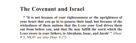 「你進去得他們的地,並不是因你的義,也不是因你心裏正直,乃是因這些國民的惡,耶和華你的 上帝將他們從你面前趕出去,又因 耶和華要堅定 祂向你列祖亞伯拉罕、以撒、雅各起誓所應許的話。」