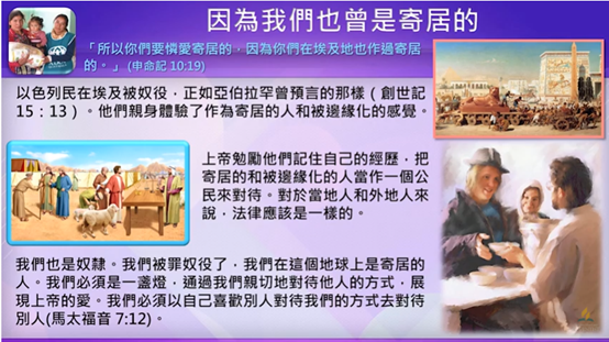 上帝勉勵他們要記住自己的經歷,要將寄居的人和被邊緣化的人當作一個公民,或是以自己人來對待。對於當地人和外地人來說,法律應該是一樣的。