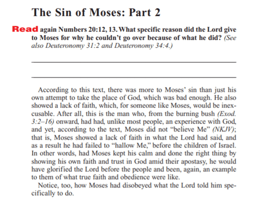上帝的命令是很明確的: 就是吩咐磐石 (民數記 20 章 8 節)。而磐石後來我們知道就是耶穌 (哥林多前書 10 章 4 節); 在出埃及記 17 章 6 節記載,磐石已經被擊打過了,因此,在希伯來書 9 章 28 節和彼得前書 3 章 18 節都說到,磐石不需要再被擊打了。摩西在過去四十年裡,都信靠 上帝。但這一次他卻沒有信靠 上帝。他的不信,阻止了以色列人把榮耀歸給 上帝,以致在那一刻 上帝並沒有得到尊崇。