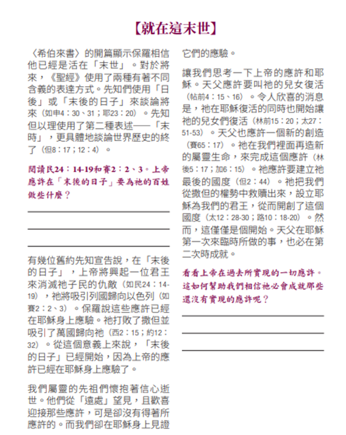 🎍 請看下一個題目:「就在這末世:希伯來書的信息」耶穌,應許之子 ~「藉著 祂兒子曉諭我們」