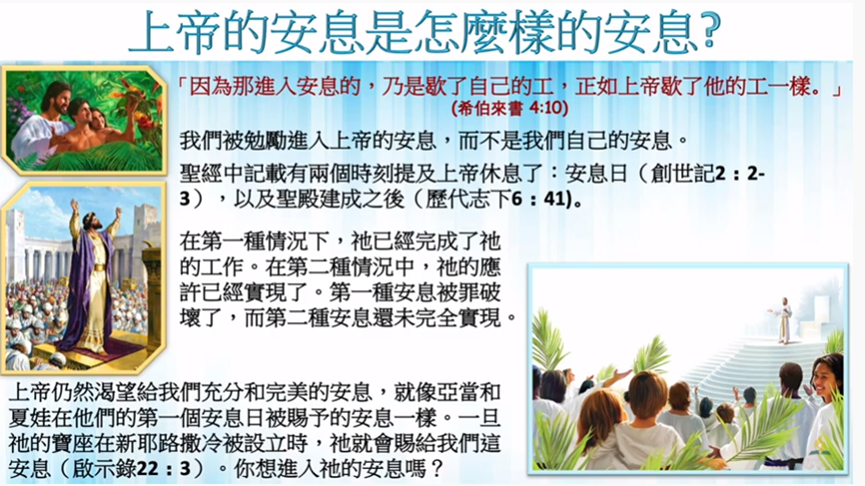 今天 上帝仍然渴望給我們充分和完美的安息,就像亞當和夏娃在當他們的第一個安息日,被賜予的安息一樣。一旦 祂的寶座在新耶路撒冷被設立的時候,上帝就會賜給我們這安息 (啟示錄 22 章 3 節)。