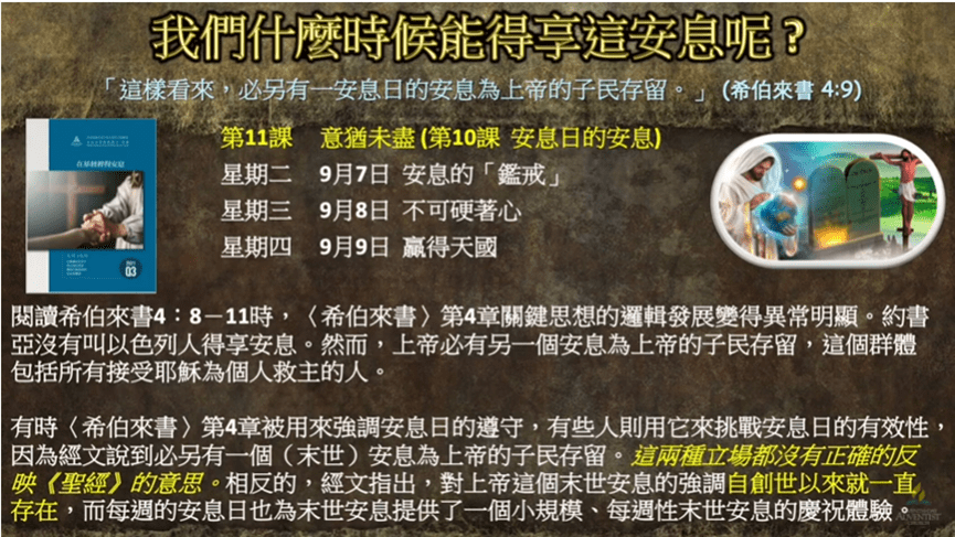 然而,上帝必有另一個安息為 上帝的子民存留。這個群體包括所有接受 耶穌基督為個人救主的人。 學課接下來提到,有時希伯來書第四章,被用來強調安息日的遵守,有些人則用它來挑戰安息日的有效性。