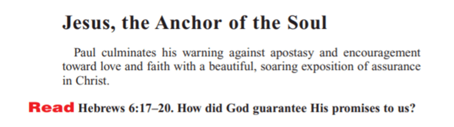耶穌升天後,祂進入幔內,坐在 上帝的右邊,作為我們的先鋒 (羅馬書 8 章 34 節、希伯來書 6 章 20 節)。 毫無疑問地, 耶穌是我們的靈魂之錨,以及尚未實現之應許的保證。