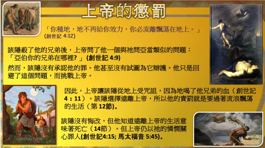 ( 創世記四章十一節: 地開了口,從你手裏接受你兄弟的血。現在你必從這地受咒詛。)