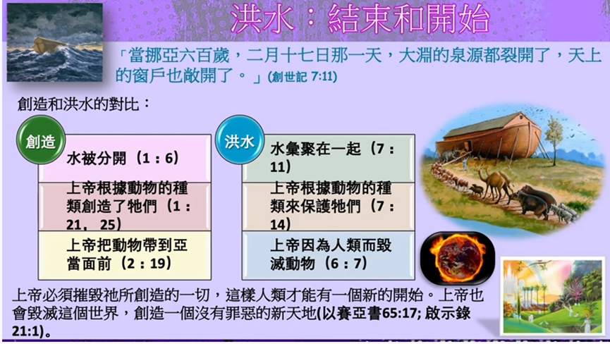 由此我們可以見到,在洪水的時候,上帝必須毀滅 祂所創造的一切,唯有這樣,人類才能有一個新的開始,因為當時的人罪惡極大,如果不是洪水,所有人最終將會自我毀滅。