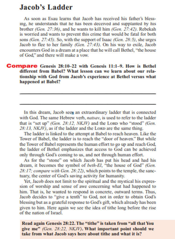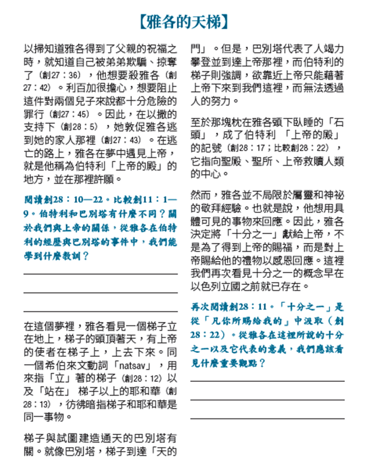 ( 創世記二十八章十一至十五節: 11到了一個地方,因為太陽落了,就在那裏住宿,便拾起那地方的一塊石頭枕在頭下,在那裏躺臥睡了, 12夢見一個梯子立在地上,梯子的頭頂着天,有上帝的使者在梯子上,上去下來。 13耶和華站在梯子以上,說:「我是耶和華-你祖亞伯拉罕的上帝,也是以撒的上帝;我要將你現在所躺臥之地賜給你和你的後裔。 14你的後裔必像地上的塵沙那樣多,必向東西南北開展;地上萬族必因你和你的後裔得福。 15我也與你同在。你無論往哪裏去,我必保佑你,領你歸回這地,總不離棄你,直到我成全了向你所應許的。」)